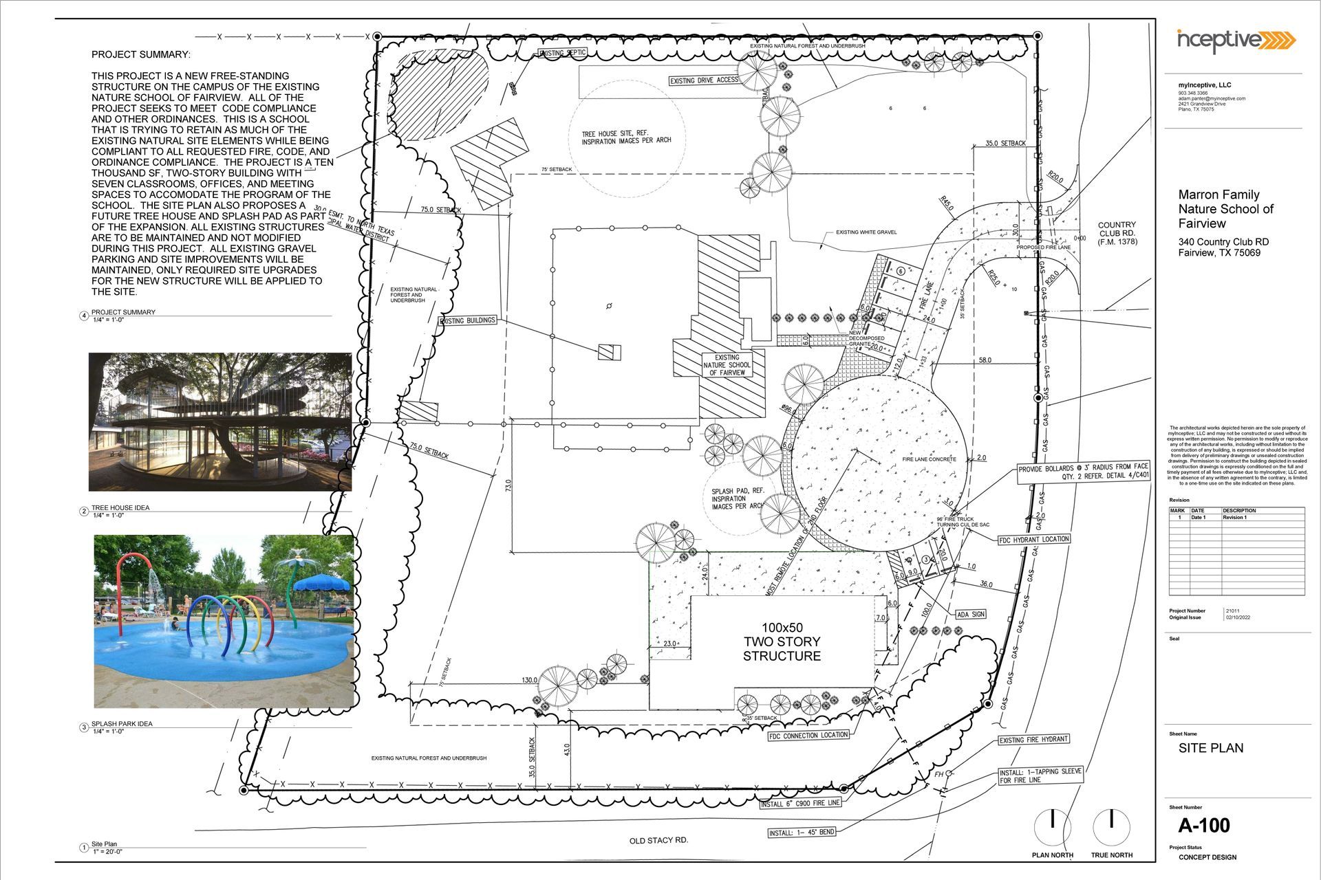 The site planning for the Nature School of Fairview is a showcase of thoughtful design that respects the environment. We are adding a new structure and required site upgrades while retaining all existing structures and gravel parking, ensuring minimal disruption to the existing campus. The plan also includes a conceptual vision for a future treehouse and splash pad, laying the groundwork for sustainable, long-term expansion that will enrich the children's learning experience. The circular design of the building, which will have a 52-foot diameter, is an homage to the site and its natural surroundings.